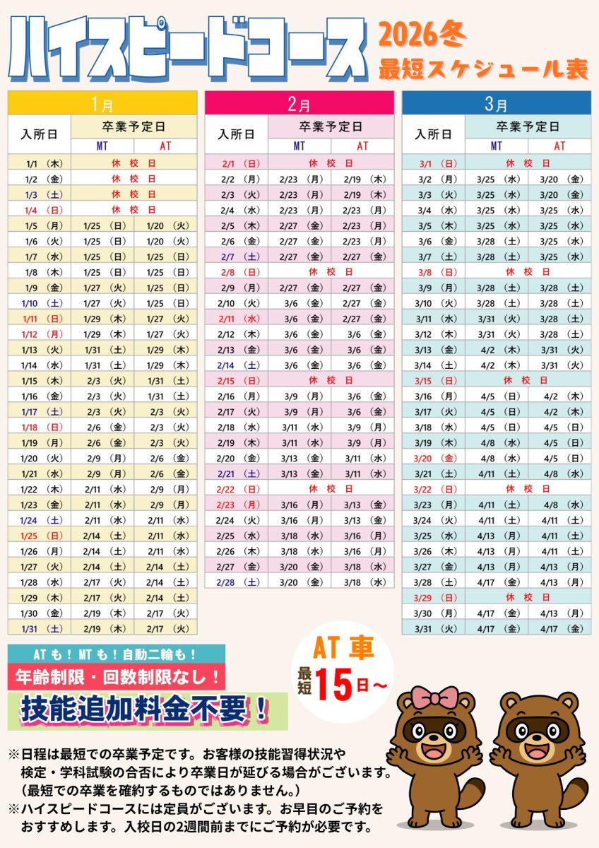 2026年1.2.3月のご予約も受け付中!仮卒や学校卒業後に短期で免許を取得したい方におすすめのコースとなっております。